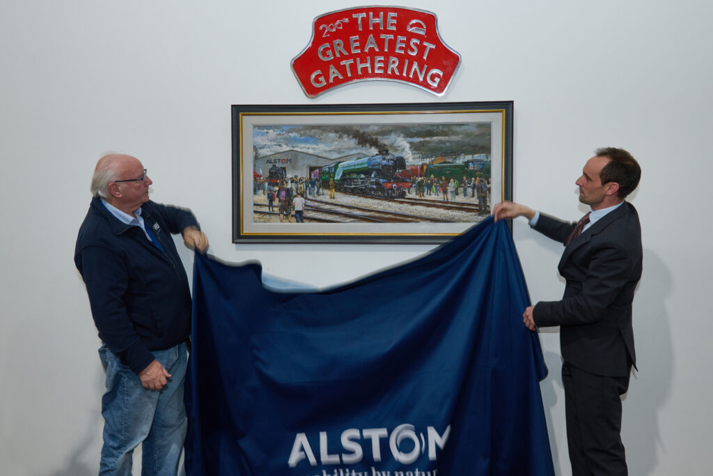 At the same time as the major fundraising announcement, The Greatest Gathering’s official artwork – a large oil painting by the event’s artist in residence, Tim O’Brien – went on display for the first time. The Nottinghamshire artist attended the entire festival where he worked ‘en plein air’ (the practice of painting outdoors) and his finished piece captures, in meticulous detail, the rolling stock and diverse groups of people that made Alstom’s festival so special.